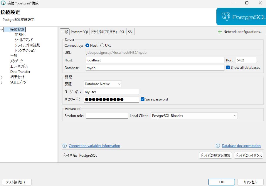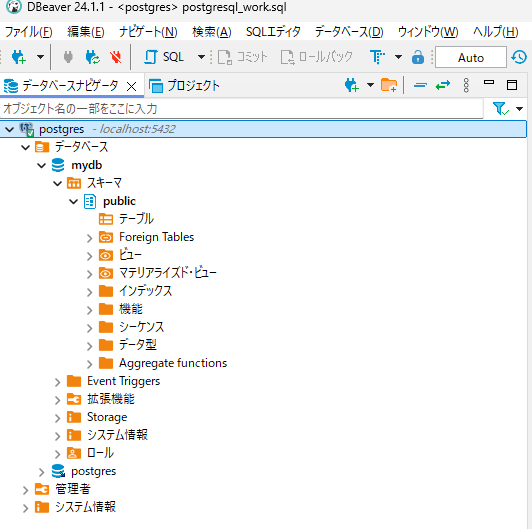 コンテナの外側である PCに「DBeaver」や「pgAdmin」などのDB管理ツールがインストールされていれば、ホスト: localhost、ポート: 5432、データベース:mydb、ユーザー: myuser、パスワード: password987 でコンテナ内のDBに接続が可能です。